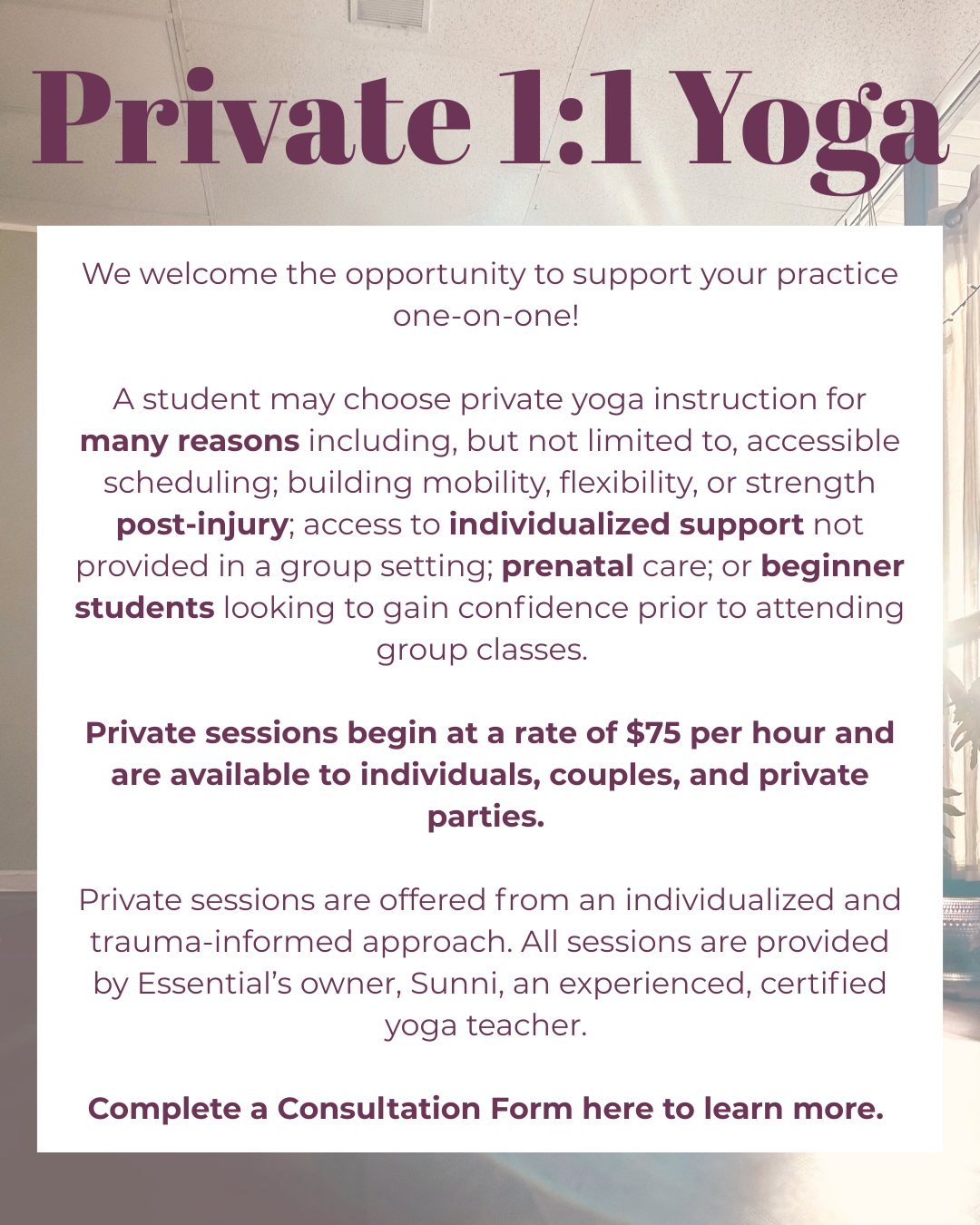 You may request private 1:1 instruction by completing the consultation form linked above OR by submitting your booking request below. Sunni will contact you within two business days to discuss your request. Please note that your booking request will not be approved until after a phone consultation is complete. We’re excited to support your yoga practice and this process helps to ensure we can meet your needs and desires.